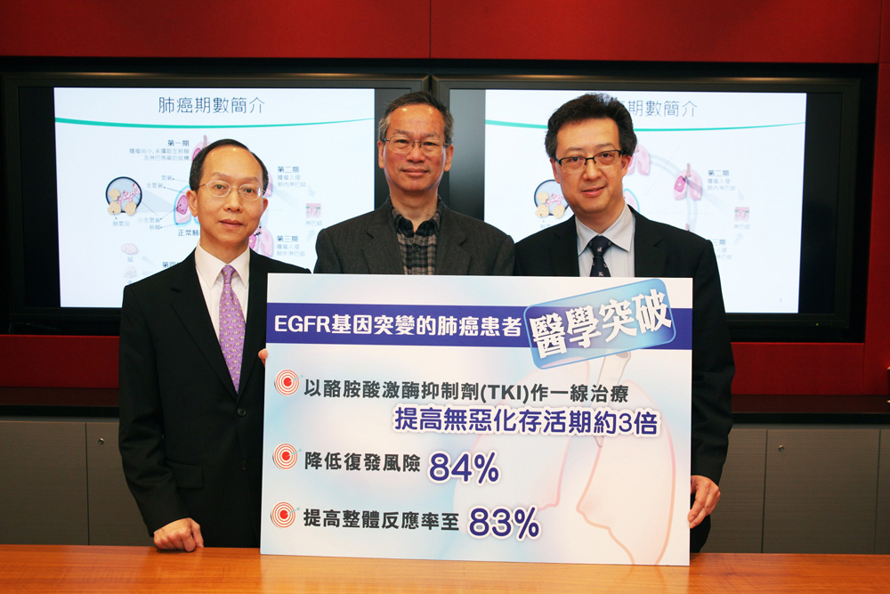 圖:岑信棠(左起)表示,以標靶藥物作為一線藥物,用於治療具EGFR基因突變的晚期肺癌患者的效果比化療理想。中為肺癌患者李先生,右為招國榮
