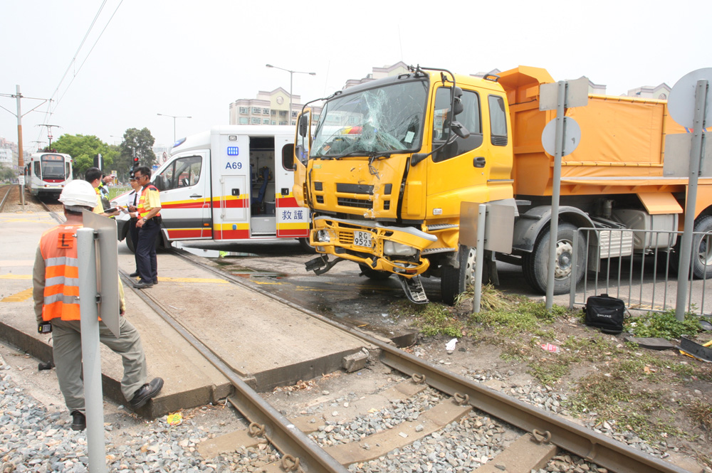 圖:泥頭車與輕鐵相撞,兩車皆車頭損毀,輕鐵更衝前十多米始停下