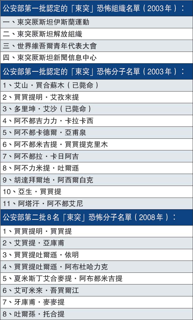 李偉介紹,前兩批公布的恐怖活動人員名單中,當時多里坤·艾沙和艾山·買合蘇木兩個頭目,均在第一批名單中榜上有名,其後在南亞進行的反恐行動中被打死;隨後阿卜杜勒·哈克接掌「東伊運」,在美國一次反恐行動中也被擊斃。