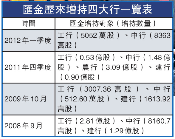 值得注意的是,匯金一季度的增持幅度超過去年。匯金去年十月宣布「在二級市場自主購入工、農、中、建四行股票」,根據四大行披露信息,匯金在去年十月十日當天分別增持了工、農、中、建A股1458.4萬股、3906.8萬股、350.9萬股、738.4萬股,耗資逾1.97億元。在隨後的兩個多月時間內,匯金再度買入工商銀行3847萬股,至二○一一年底持股數增至1236.94億股,持股比例為35.43%。