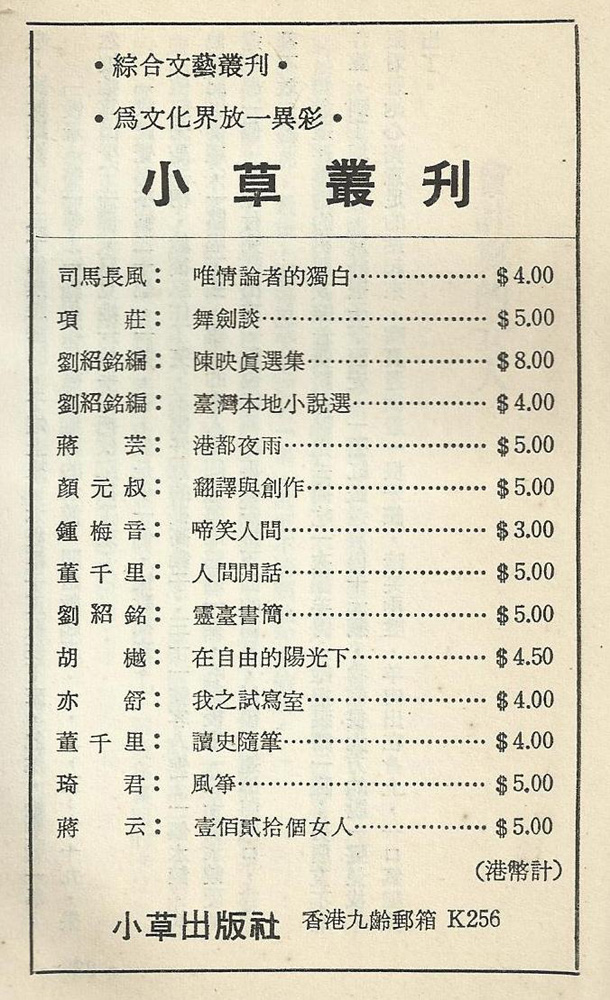 一九七○年代初期,本港出現過一所以九龍郵箱作通訊處的「小草出版社」,出過一套四十開本袋裝書的《小草叢刊》。這套書好像同時也出台灣版,但現時已難得一見,據資料顯示共出十四種,最初的一種是司馬長風的《唯情論者的獨白》(一九七二),最後的則是蔣芸的《一百二十個女人》(一九七四)。事有湊巧,我手邊剩下的也正是這兩種。