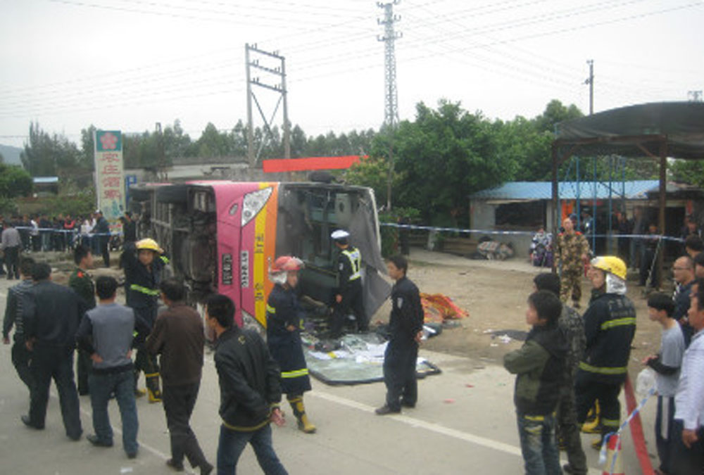 事故現場有一輛電動摩托車翻倒在地,車子旁邊有兩攤血跡,其中女乘客已證實死亡。有知情者透露,事發時,由於有一輛電動摩托車突然從右側小路駛上國道,與正好路過的大客車發生碰撞,大客車司機急打方向盤,衝到對向車道後向左側翻。