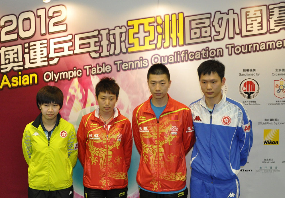 圖:港將梁柱恩(右一)和李皓晴(左一),與國乒的馬龍(右二)、郭躍於抽籤後合照\本報攝