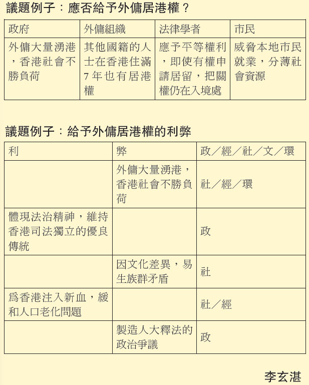 通識議題取材自世界的問題,同樣包羅萬象,理出公式和脈絡應對這些五花八門的議題,機械化處理,能提高教學效率。我認為議題不外乎是「持份者爭議」及「影響利弊」,當中「持份者意見」、「利弊」和「多角度」三個維度互相緊扣,兩個總表就能對議題有宏觀了解,掌握後,答回應資料題中的10分題目時,自是得心應手。這已算完成一個教學循環,至於第三環節,屬於「促進學習的評估」,有機會再談。