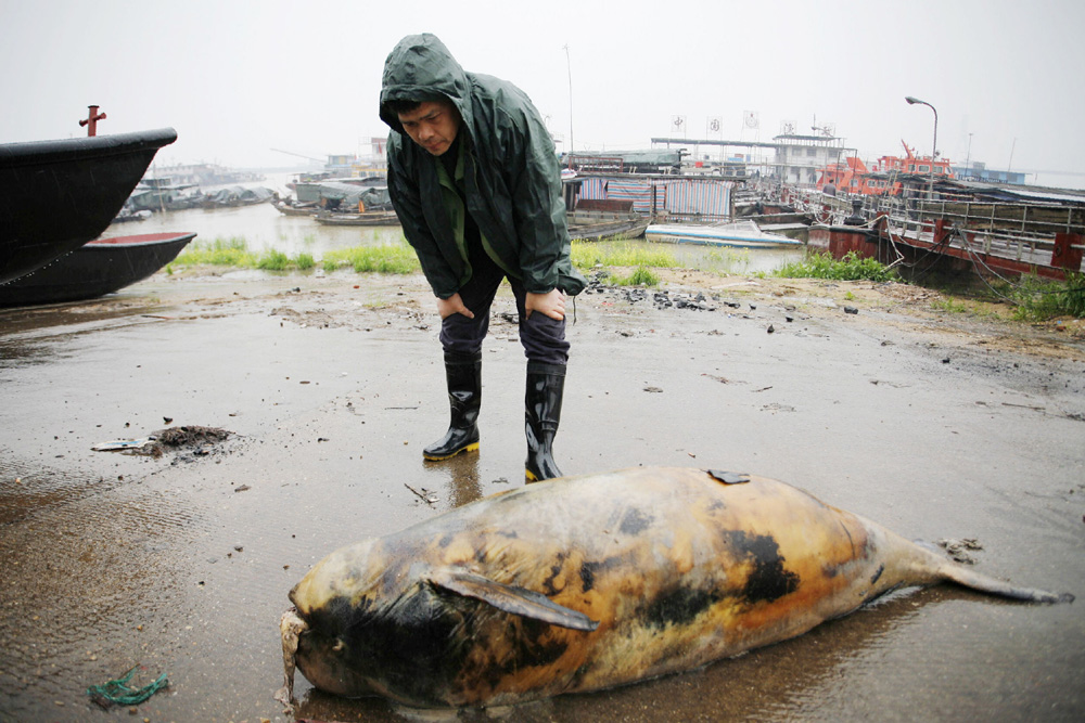 圖:4月中旬,在湖南岳陽鹿角鎮碼頭,一隻江豚的屍體被打撈上岸。整個長江流域這一物種僅剩下約1200頭左右,其種群數量甚至已經比國寶大熊貓還少\中新社