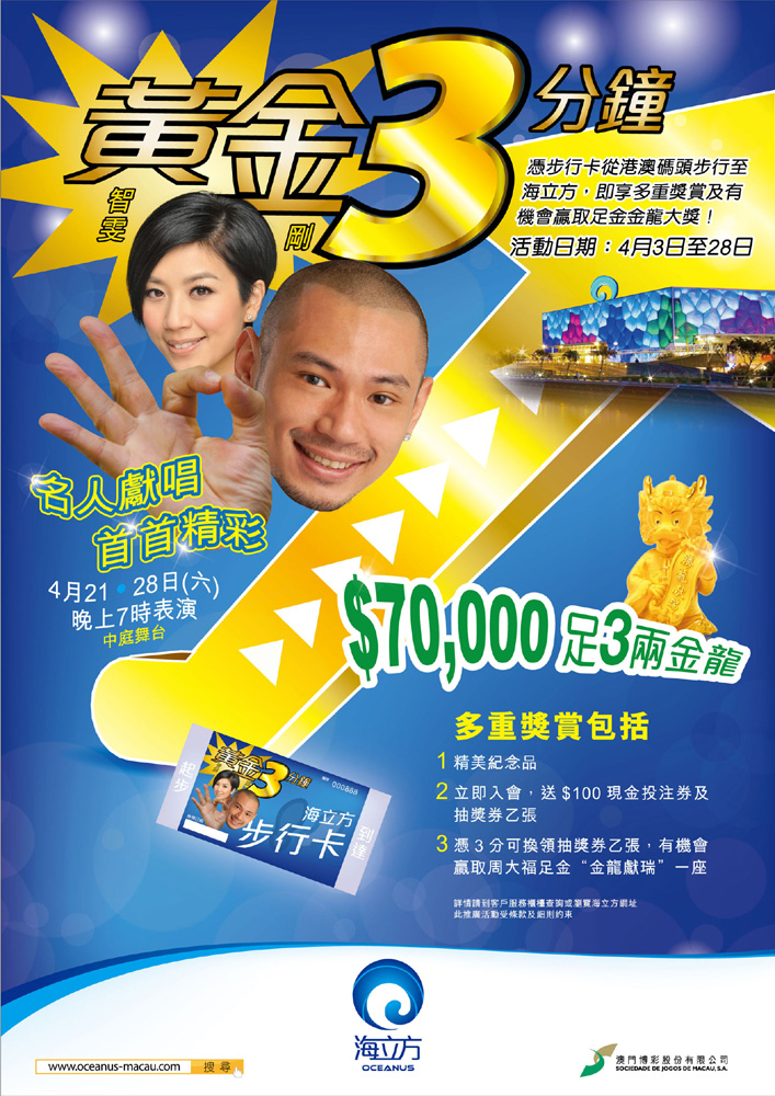 【本報訊】澳門消息:澳門的海立方娛樂場本月會推出一連串精彩表演、豪華禮品以及新穎好玩的遊戲。由即日起至本月三十日,每位參加者憑步行卡從港澳碼頭步行至海立方即可獲贈精美紀念品乙份。本月二十一及二十八日,海立方邀請了演藝名人金剛及黃智雯,主持「黃金三分鐘」金龍大抽獎,同時獻唱經典名曲多首。會員同時亦可於「黃金三分鐘」(見圖)舉辦期內以每三分換領抽獎券乙張,換領張數不限,換領愈多,中獎機會愈大,隨時有機會贏取價值港幣七萬元周大福足金「金龍獻瑞」一座。