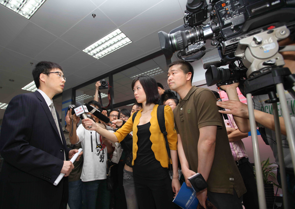 圖:26日,溫州民間借貸登記服務中心總經理徐智潛(左)接受媒體採訪\新華社