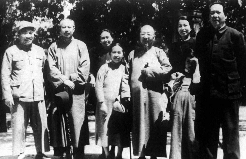 圖:1950年,柳亞子(左五)與毛澤東(右一)、朱德(左一)等人合影\資料圖片