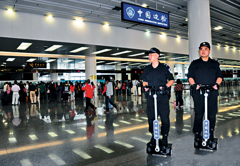 圖:皇崗邊檢站特勤隊在福田口岸出境大廳執勤