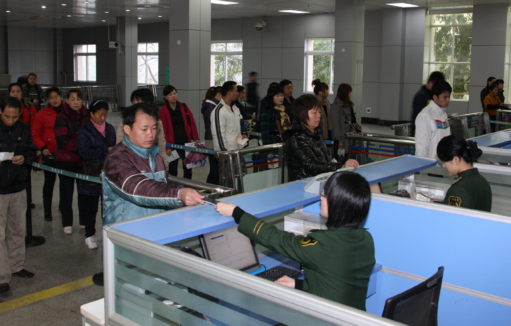 圖:中越邊境口岸努力提高服務質量,便捷旅客出入。圖為旅客在東興邊檢大廳辦理過境手續\王建民攝