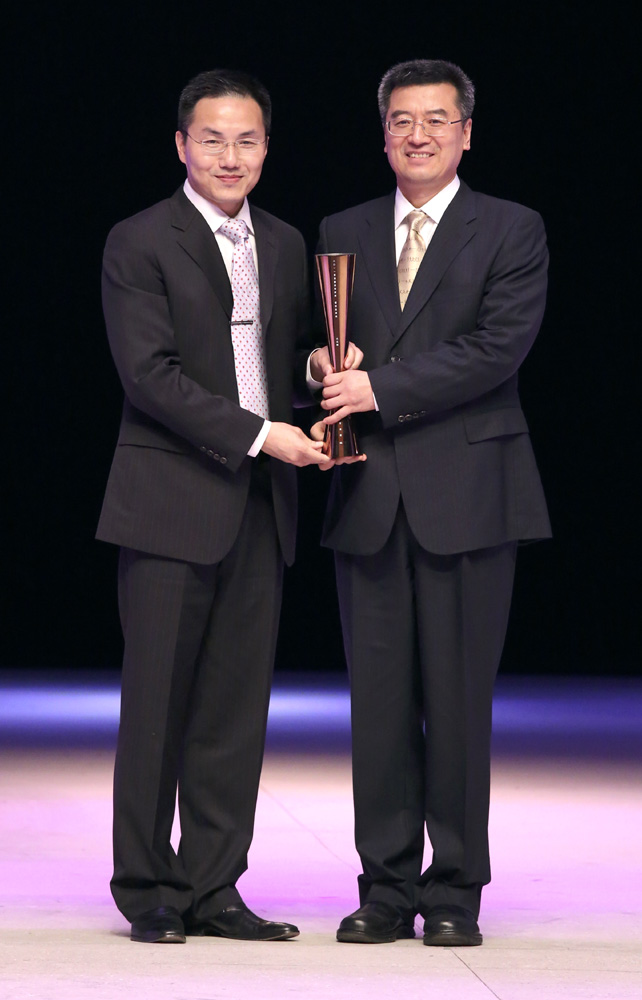 圖:《大公報》總編輯賈西平(右)在廣播處長鄧忍光手上接過「藝術推廣獎」銅獎  /本報攝