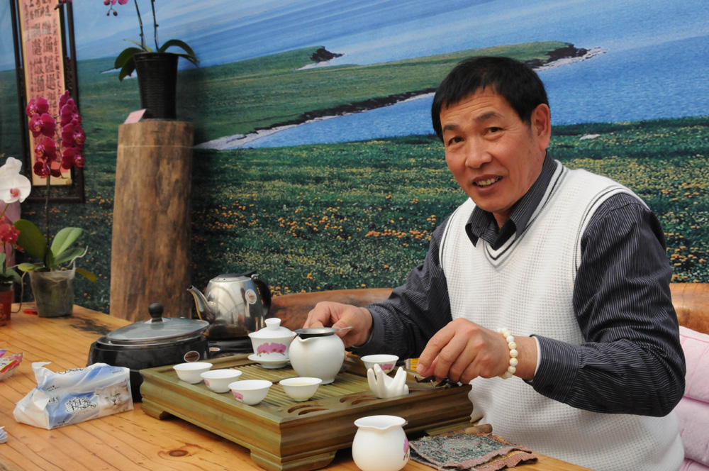 圖:「花王」黃瑞寶一邊泡着台灣凍頂烏龍茶一邊向本報記者介紹,自己的蘭花生意已做到了全世界。他背後為鉅寶公司的全球業務分布圖/史兵攝