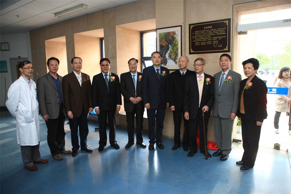 圖:詹氏三兄弟詹洪良(右2起)、詹榮良、詹耀良與校領導及校醫院負責人在金秀樓銘牌下合影留念
