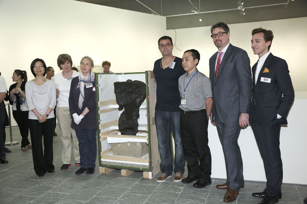 圖:工作人員與嘉賓在畢加索雕塑《留鬍子男人的半身像》開箱時合影 本報攝