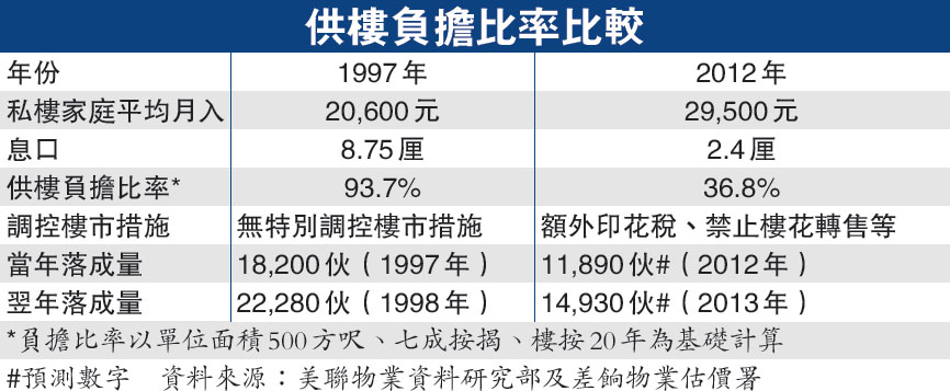 至於與1997年樓市泡沫爆破前相比,劉嘉輝稱,雖然現時樓價與當時相若,平均呎價達6000元,但在1997年第二季平均按揭利率高達8.75厘,故供樓負擔比率亦高達超過九成水平。他續謂,目前私人住宅家庭的平均收入達2.95萬元,較當年2.06萬元大幅增加達43%,同樣是供樓負擔比率未回到當年水平的原因。