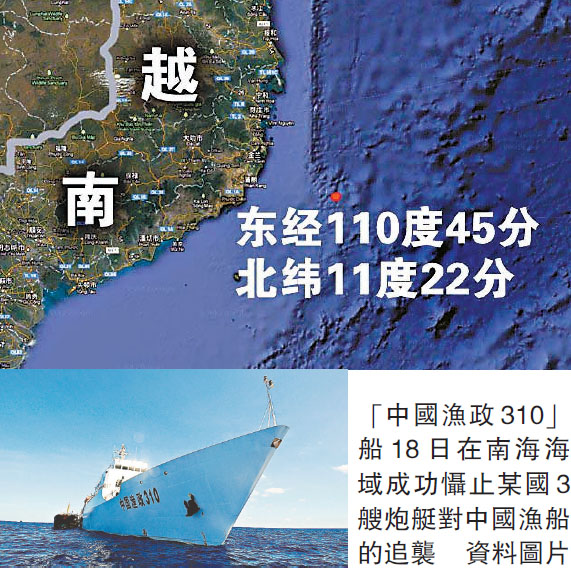 【本報訊】5月18日,「中國漁政310」船成功懾止某國3艘炮艇對中國漁船的追襲,保護了5條中國漁船、100多名中國漁民免受財產損失和人身傷害。