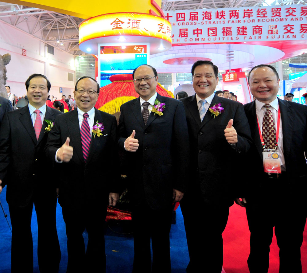 圖:5月18日,國台辦常務副主任鄭立中(右三)與中國國民黨副主席蔣孝嚴(左二)參觀台灣館的金門展台/新華社