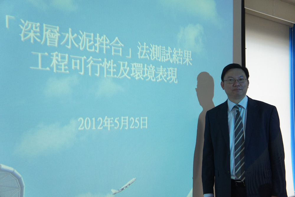 他指出,雖然「深層水泥拌合」法相較傳統的填海方法造價增加3-4倍,但效率較快。為配合機場發展,希望能在2020年─2023年左右第三條跑道能投入服務,而填海施工過程是一個非常重要的過程,但仍需要進一步的評估才能知道確切能快多少。早前有環保人士擔心此舉將對海豚造成影響,他強調,下一階段將聘請海豚專家,進一步評估對海豚的影響。並補充,「在施工過程中,有聘請專業人士關注海豚出沒,一旦有海豚,將立即停止開工,並在海豚離開30分鐘後,才會恢復工作。」但過程中沒有海豚的記錄。