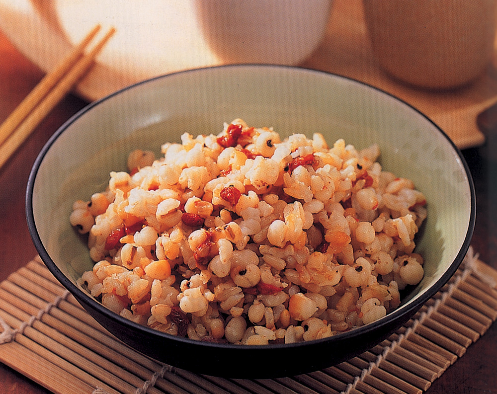 圖:用薏米加糙米和枸杞子煑飯食,有健胃整腸、美顏抗癌的食療功效。炮製時先將糙米和薏米(比例1:1)預先用清水浸泡2小時,加入杞子和清水用電飯煲煮熟即可。