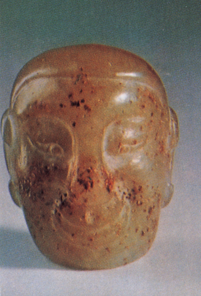 附圖為六朝時期雕琢之玉僧首,屬於立體玉人頭一種;雖神態活現,但卻不脫寫實窠臼,缺少新石器時代玉人頭那種古拙抽象美。不過,六朝玉器真品遺留至今者極少,甚難遇見。