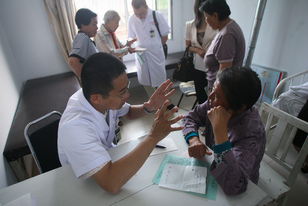 圖:9日,在呼和浩特市土默特左旗塔布賽鄉衛生院,一名北京協和醫院的醫生(前左)在為當地百姓義診\新華社