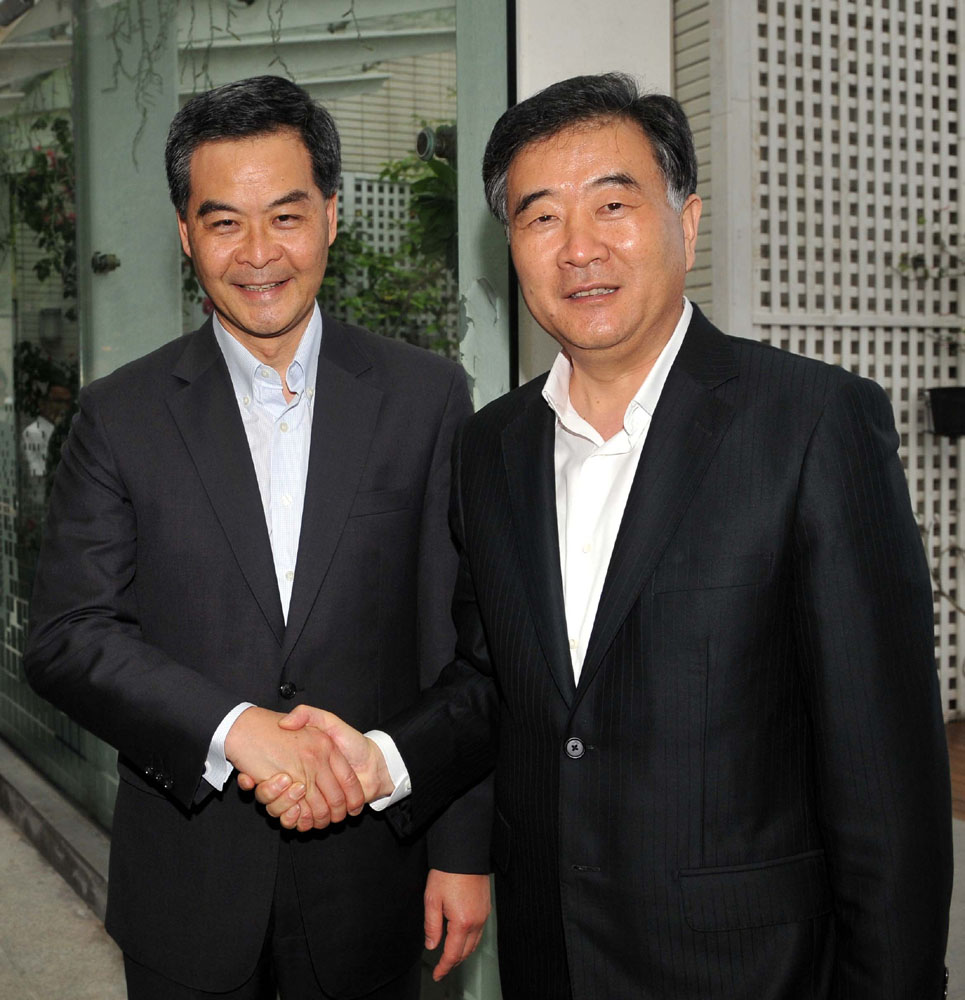 圖:候任行政長官梁振英與來港的中共中央政治局委員、廣東省省委書記汪洋會面