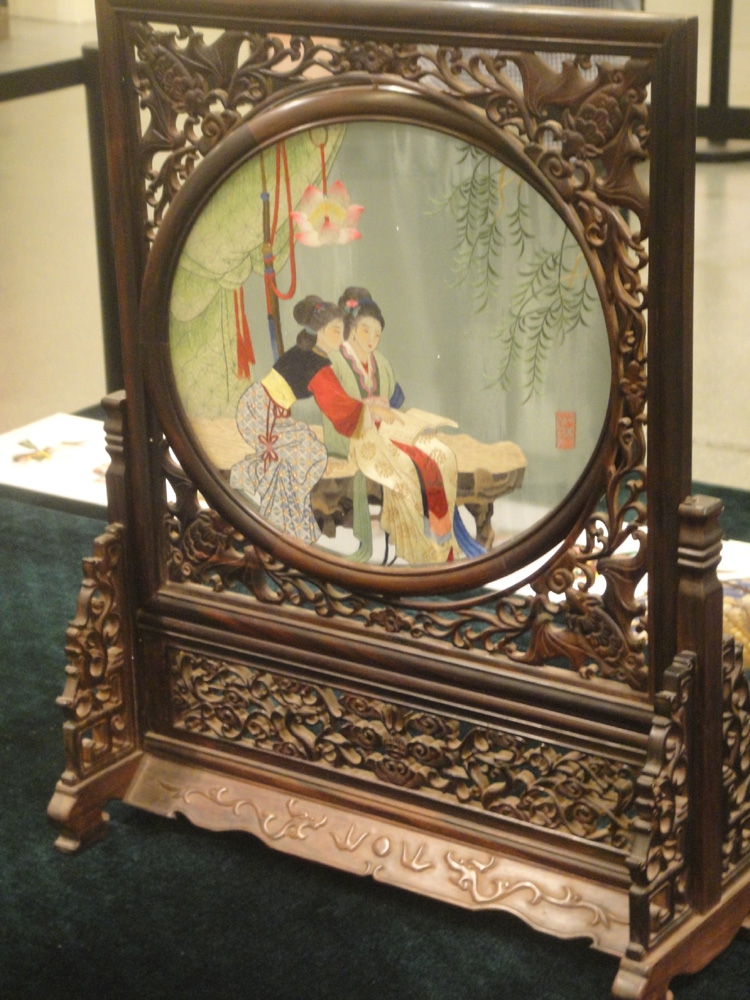 展品中有雙面繡、異色繡和三異繡三種蜀繡中高難度的技藝成品。雙面繡即是在薄紗之上,一次繡出雙面有同樣圖案的作品。異色繡則是兩面具有不同的顏色,此次所展出的異色繡作品是牡丹鯉魚,鯉魚圖案在蜀繡中很常見,因為鯉魚在民間有吉祥如意、年年有餘之意。作為蜀繡工藝難度最高的三異繡,即在透明絲帛之上,繡出雙面構圖、色彩、針法截然不同的繡品。此次展出的三異繡作品,一面是大小喬的美態,一面又是國寶大熊貓的憨態可掬。