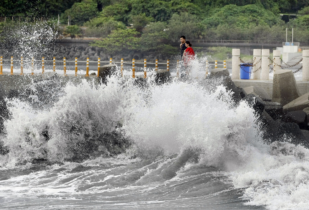 圖:颱風泰利來勢洶洶,高雄西子灣海岸18日出現數公尺高的巨浪,聲勢驚人,一對情侶在岸邊觀浪/ 中央社