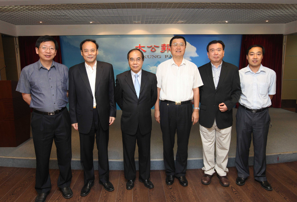 圖:左起:江蘇省委統戰部海外聯絡處處長封志成,江蘇省委統戰部副部長周和平,大公報副社長馮仲良,江蘇省政協副主席、江蘇省委統戰部部長羅一民,大公報助理總編輯郭震,江蘇省海外聯誼會副秘書長胡敏弟合影/本報記者蔡文豪攝