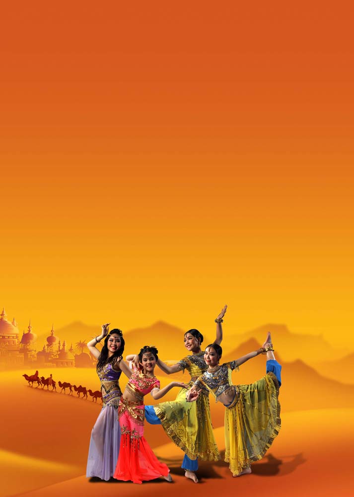 《東方·絲路》以十四個舞段展現亞洲不同民族的民間故事、舞蹈藝術及當地傳統習俗,為觀眾塑造多幅瑰麗多彩的東方風情畫:歡快跳脫的日本阿波舞;氣韻生動的韓國舞;輕快流暢的馬來西亞舞;節奏明快的印尼舞;靈秀的敦煌舞,融合中原、新疆及印度文化;着重手、眼、心、意合一,眉目傳情的印度舞;充滿阿拉伯風情和婀娜多姿的肚皮舞等等,適合一家大小共度消暑文化旅程。