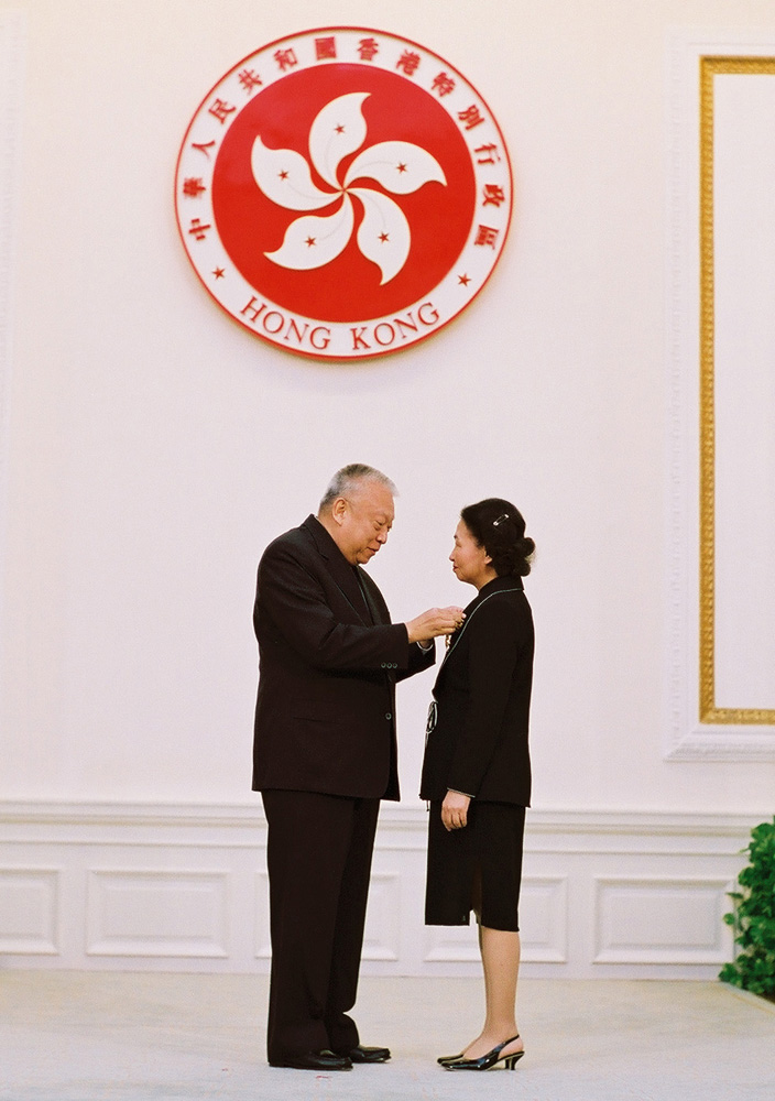 圖:二○○二年,時任律政司司長的梁愛詩,獲時任行政長官董建華頒授大紫荊勳章