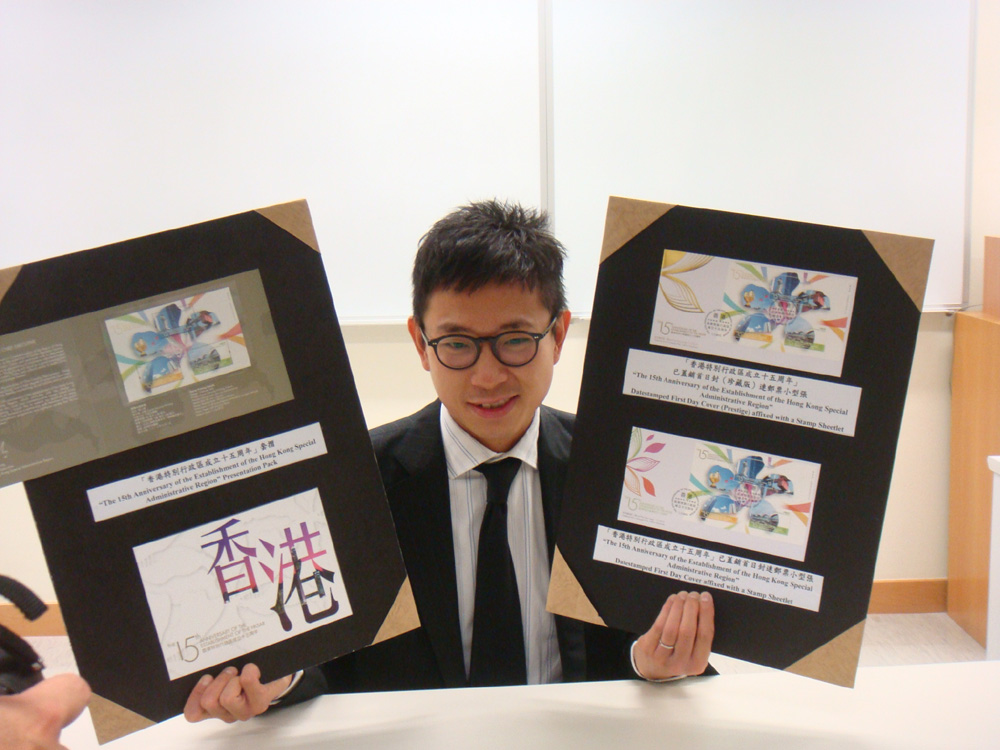 圖:郵票策劃及拓展處高級經理李振宇展示回歸紀念周年郵票/本報記者陳曉茵攝