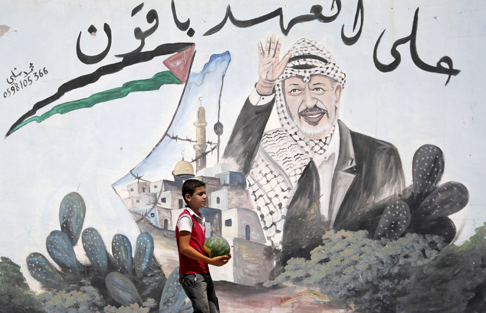 圖:4日在約旦河西岸的一處村莊,一名巴勒斯坦少年經過一面畫有阿拉法特肖像的牆壁\美聯社