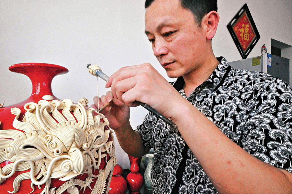 圖:黃培聰正在製作漆線雕