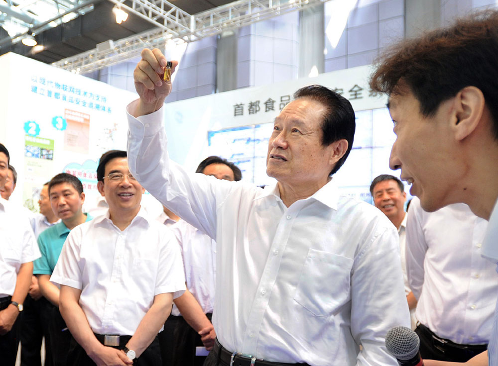 圖:在中關村國家自主創新示範區展示中心首都食品安全系統展台前,周永康觀看食品安全檢測結果/新華社