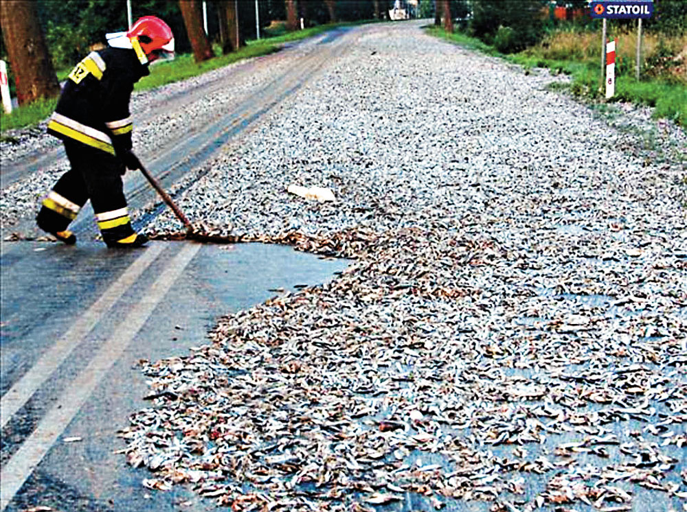 波蘭的科沃布熱格最近發生了一起「規模宏大」的烏龍事件。一位遲鈍的貨車司機在運貨過程中忘了關緊貨車車廂的後門,開車之後,24噸重的沙丁魚從貨車上狂泄而下,綿延數百米,造成嚴重交通堵塞。/英國《每日郵報》