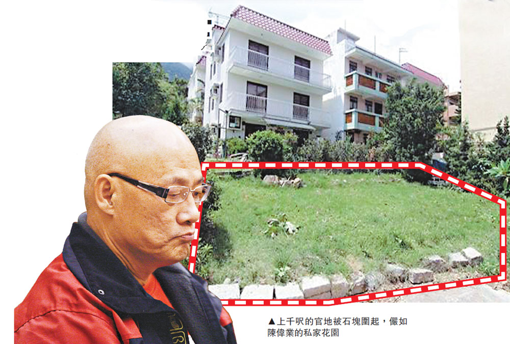 陳偉業去年在傳媒追問下,死撐指沒有興建「私人花園」,聲稱屋前用地公眾均可使用,但䃟石灣村原居民村代表毛銀福表示,陳偉業住宅門外的用石塊圍起的草地屬官地,而且自九八年開始,陳偉業搬入䃟石灣村後,便在官地上鋪草皮,並用石塊圍起,批評有關做法不當。另有村民透露,過去有村民申請在陳偉業門前的官地興建丁屋,但遭陳偉業和他擁護當選的村代表反對,此後再沒有人敢再打那官地作興建用途。該村民批評陳偉業自私,反對只為保住住宅正前方的開揚景觀和「私人花園」。