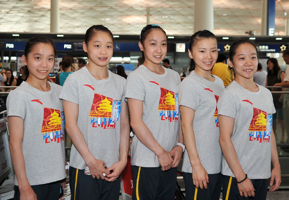 圖:體操女隊成員姚金男(左起)、眭祿、黃秋爽、何可欣和鄧琳琳,準備出發前往倫敦/新華社