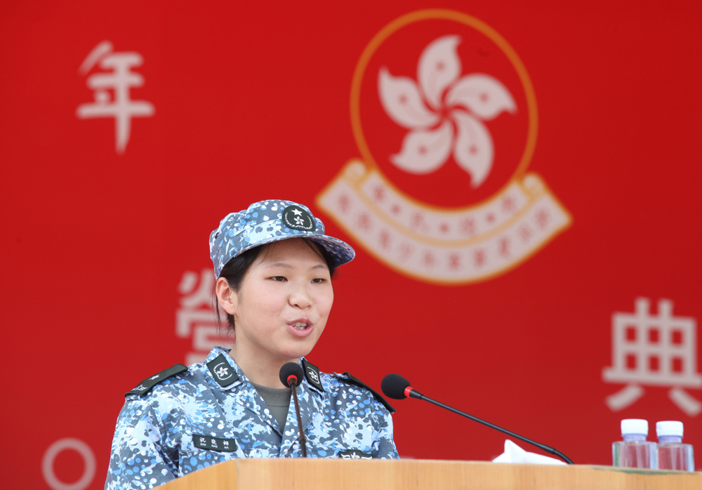 來自聖言中學的李金鵬,即將升讀中四,他代表今屆學員上台致辭時表示,來駐港部隊軍營接受軍事訓練,是每個香港青少年的光榮,他期望經過這十五天的艱苦磨練,能夠穫得克服逆境的自信、待人接物的成熟、對祖國更深入的了解,以及一群並肩作戰的「戰友」。