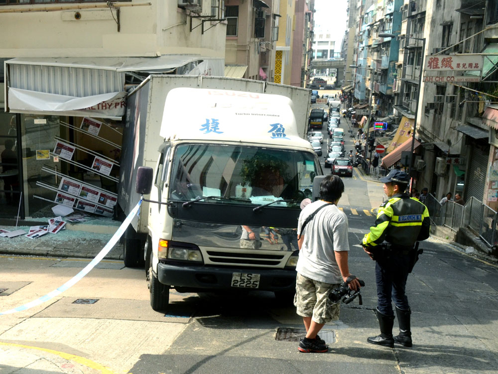 昨日下午三時許,一名姓邵司機(四十六歲)駕駛密斗貨車運送廁紙等日用品,沿東邊街上斜擬右轉第二街,當時第二街有車輛馳至疑沒停車讓路,貨車司機剎車閃避,詎料再度「踩油」時或路面太斜,無法上行更失控溜後,其間有一輛的士上斜,的士司機慌忙「入後波」兼扭軚,幸好及時避過。但貨車倒衝約五十米,最後撼向一間地產代理舖。