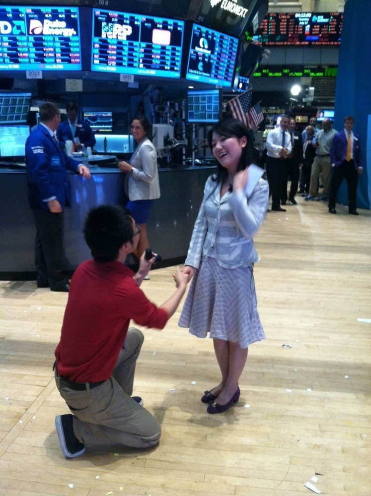 七月十八日紐約交易所上演了一幕浪漫的求婚喜劇。新華社駐紐約記者紀振宇向新華社北美總分社記者俞靚求婚成功。身穿紅色襯衣的紀振宇手上拿着黑色小盒子,單膝跪下向正在報道的俞靚求婚。一句「我願意」令整個交易廳爆出熱烈的掌聲。有人指,求婚效應令美股在當日止跌回升。