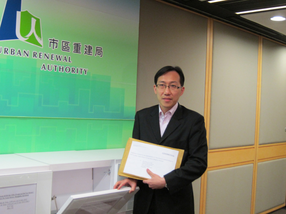 在8號颱風懸掛前夕,各地產商代表紛紛到達市建局總部遞交意向書。該局昨傍晚宣布,項目合共接獲18份合作意向書,轄下遴選小組將挑選合資格的機構投標,預計招標工作將於短期內展開。
