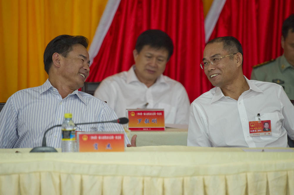 圖:三沙市市長肖杰(左)與人大常委會主任符戇在會間交談/中新社