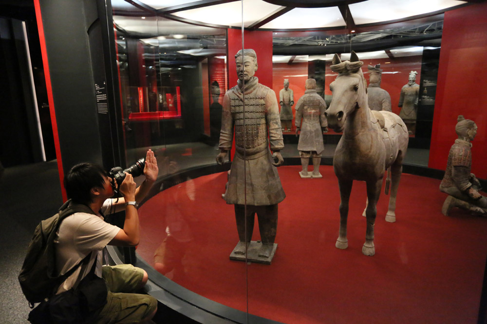 緊接着的是文物展示區,二千多年前的珍貴文物盡現眼前。有兵馬俑中級別最高的鎧甲將軍俑和無甲將軍俑,至今出土的僅有九件;仍然保存着部分顏料的彩繪跪射俑,依稀可見秦代流行的顏色;青銅仙鶴和天鵝,形象地再現珍禽在河邊覓食的場景;還有見證中原文化交流的金器、秦朝宮廷使用的玉杯和至今出土最小的兵馬俑等等。每一件展品都配有詳細的文字說明,觀眾還可使用錄音導賞,或智能電話讀取QR碼來獲取展覽資訊。