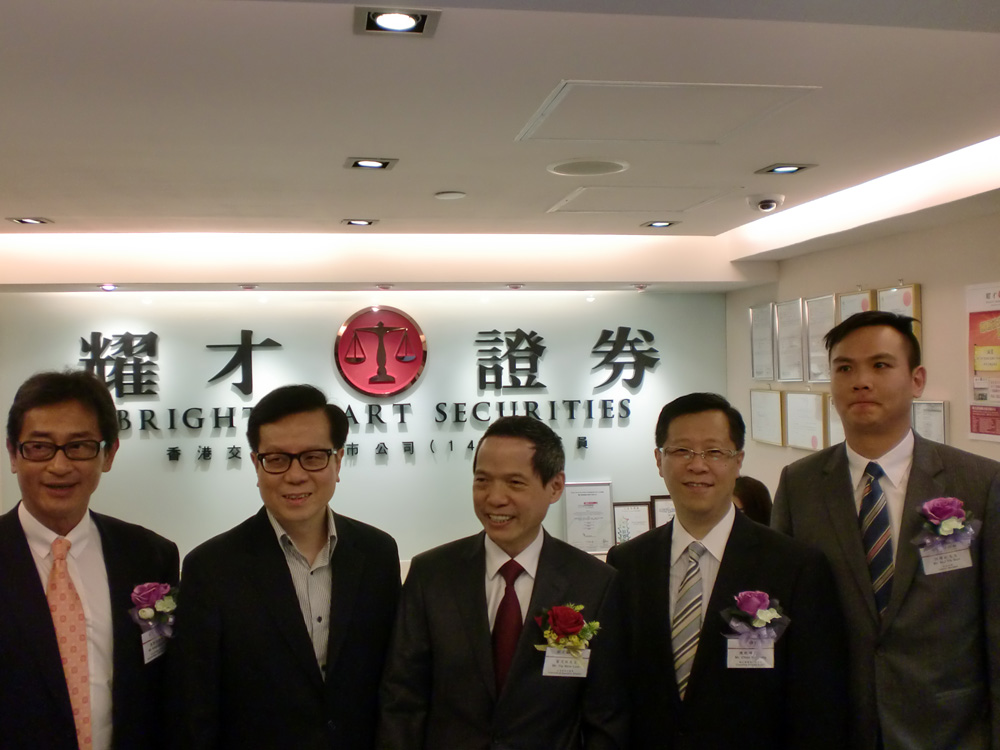 圖:左起:郭思治、獨立股評人陳永陸、葉茂林、耀才證券行政總裁陳啟峰及分區經理許繹彬,同在鰂魚涌分行相聚\本報攝