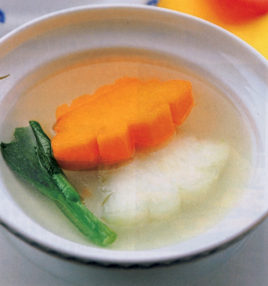 原料:南瓜1片(75克),冬瓜1片(75克),素火腿2片,青菜1條,素上湯200克,鹽適量。
