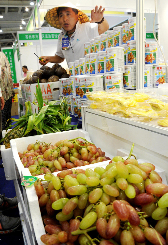圖:大陸各地台商普遍認為,投保協議對推進兩岸雙向投資具積極作用。圖為一名台灣果農參加10日在蘇州舉行的兩岸農產品交易會\新華社