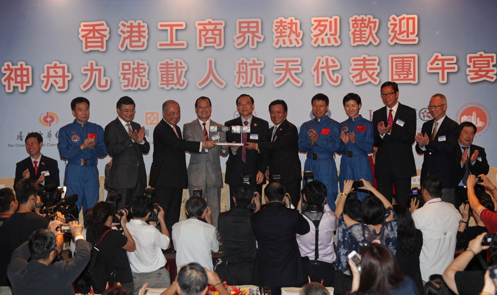 香港中華總商會會長蔡冠深致辭時憶起,一個多月前通過電視畫面,看到天宮一號和神舟九號成功進行了自動和手動交會對接,標誌着國家載人航天技術又再超前一大步,「我們實在感到無比驕傲和自豪」,所以藉此機會向三位航天員以及全體專家和技術人員致敬。