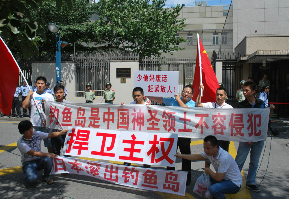 據在場人士描述,在短短一個小時內,就有 兩撥民眾分別前往,規模分別達到十幾人和三十幾人。他們手舉「嚴重抗議日本非法扣押中方人士」、「要求日本立即無條件放人」等標語,高喊「收復釣魚島」等口號,並往領館內投擲空啤酒瓶等。亦有部分民眾拿着國旗及擴音器前來,要求日本滾出釣魚島,並向領館投擲水瓶。