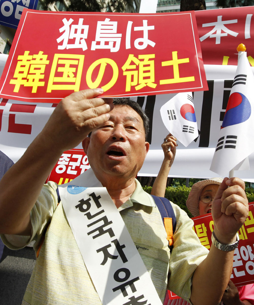 圖:17日在首爾,韓國示威者在日本使館前就獨島問題進行示威抗議/法新社